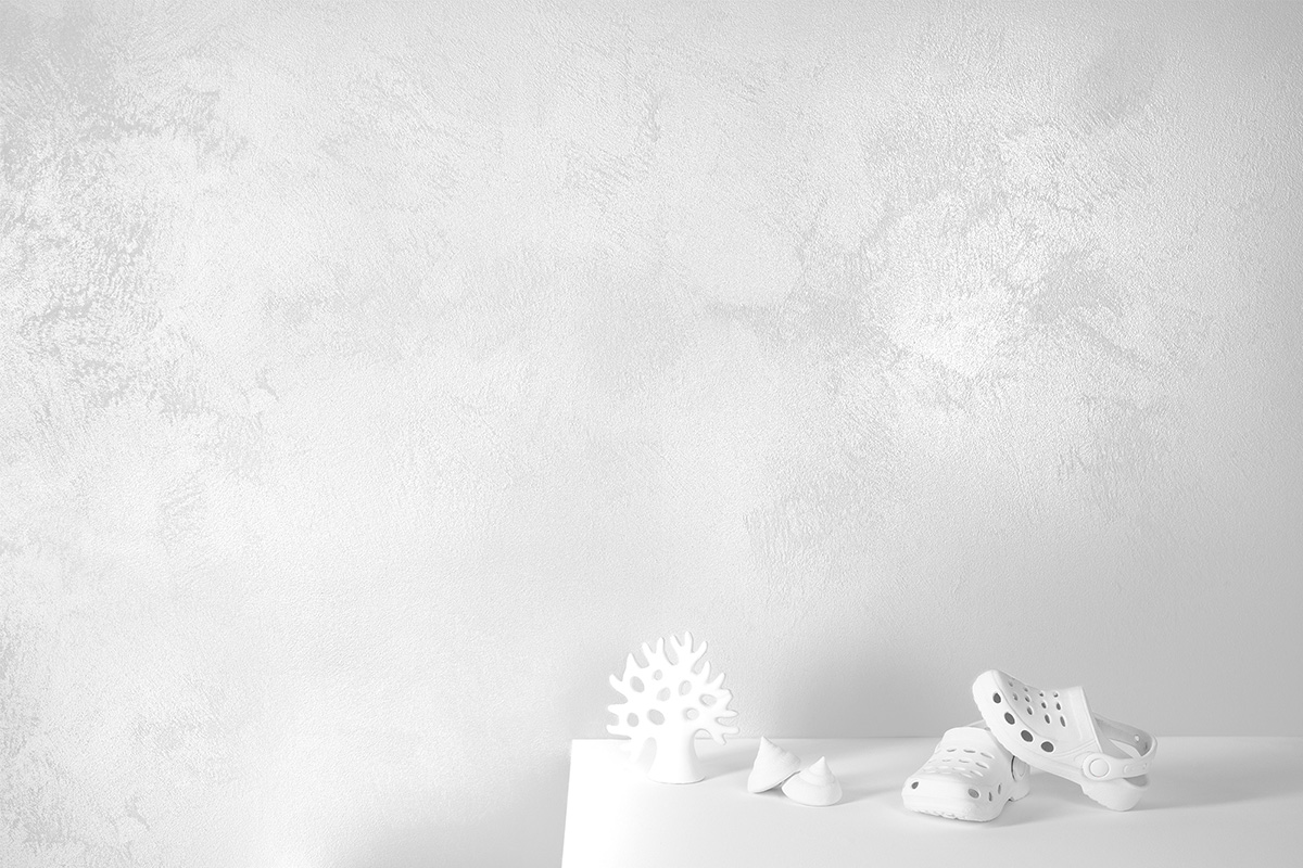 Finitura decorativa all’acqua super bianca ad effetto sabbiato metallico opaco.