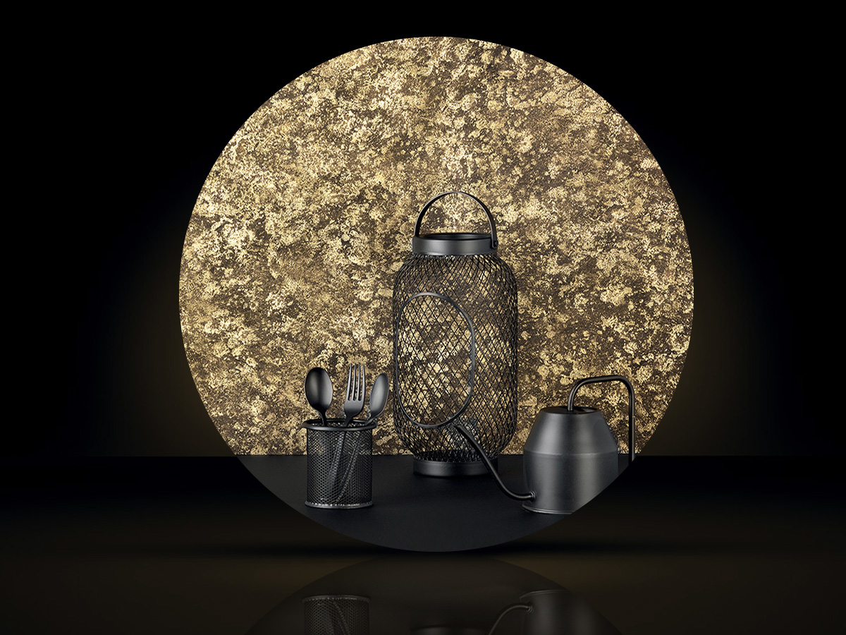 Pittura decorativa a base di 6 colori di floccoli metallici a granulometria grossa.