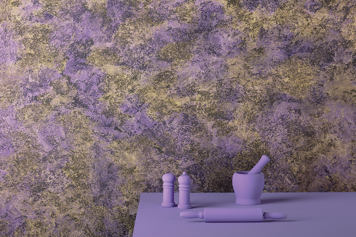 Finitura decorativa a base di floccoli con colori metallici cangianti differenti applicati contemporaneamente.
