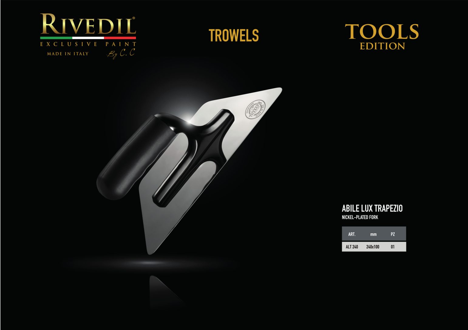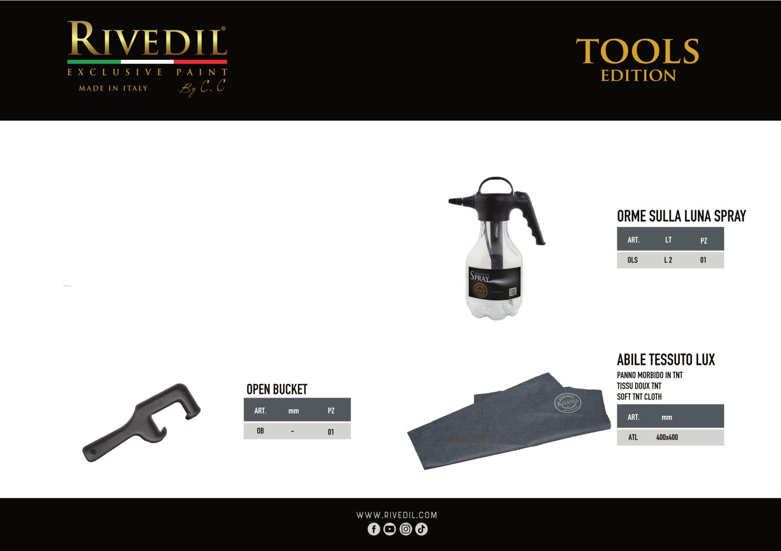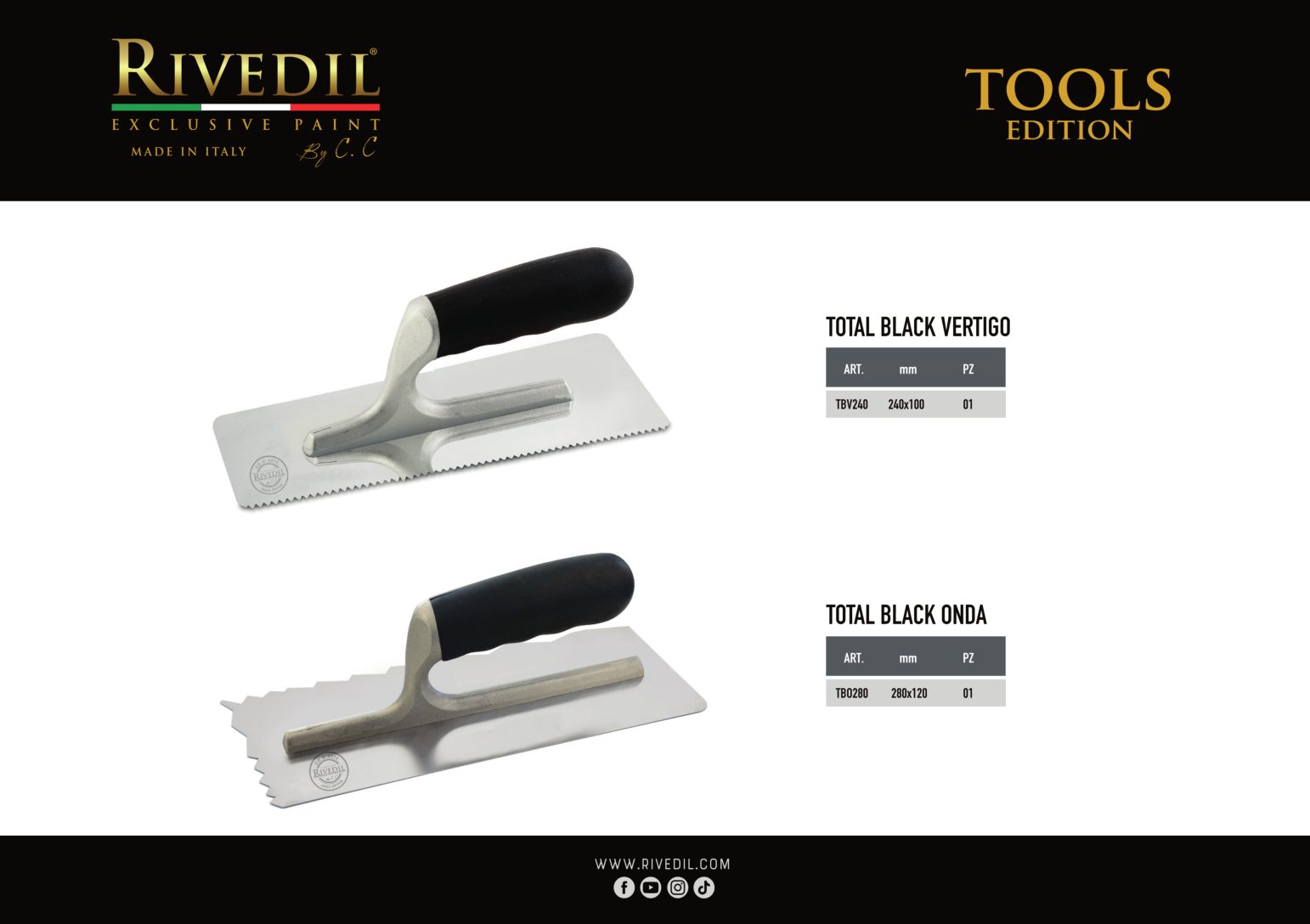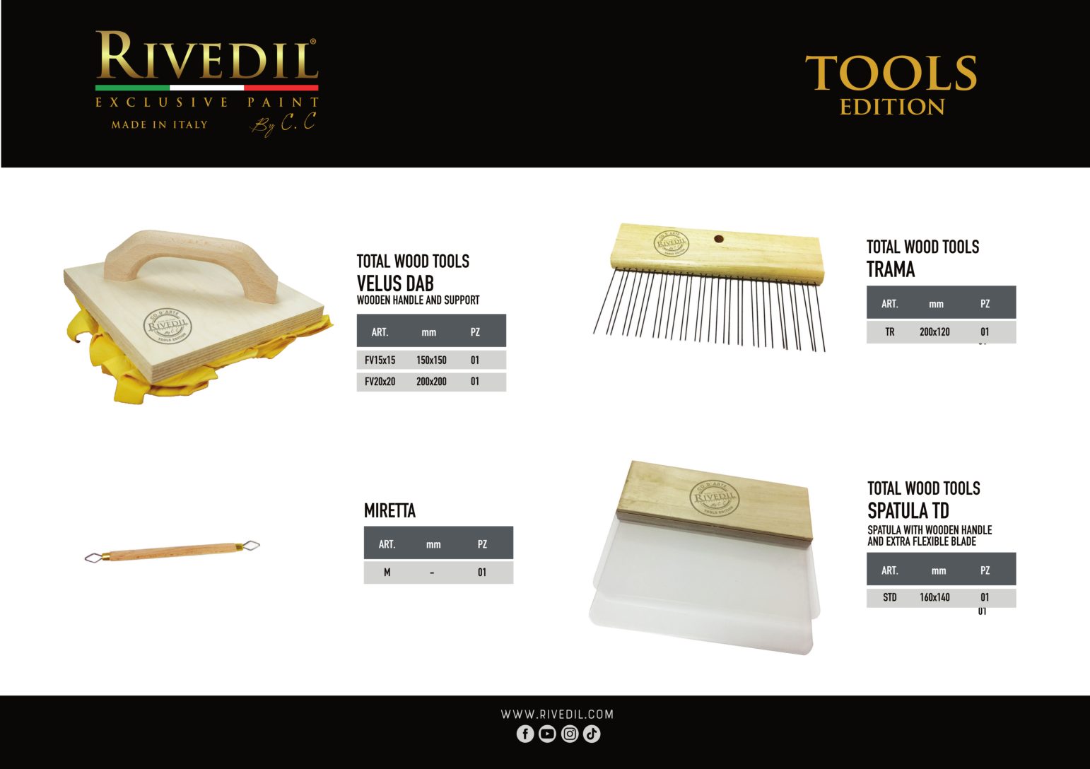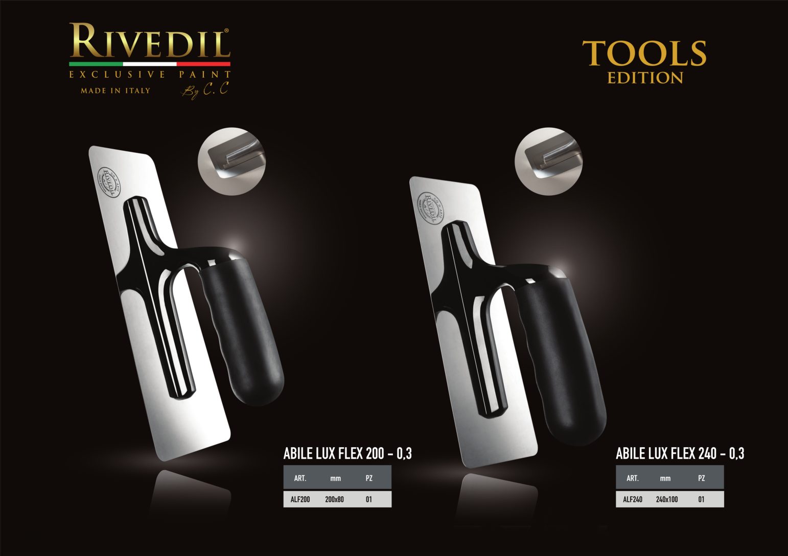 RIVEDIL mette a vostra disposizione una gamma completa di TOOLS professionali della migliore qualità. I TOOLS riportano il brand Rivedil elegantemente inciso a laser. Ogni TOOL é stato selezionato e provato dai nostri MASTER, sulla base di una decennale esperienza. I nostri TOOL ti permetteranno di realizzare le tue idee con progetti unici..