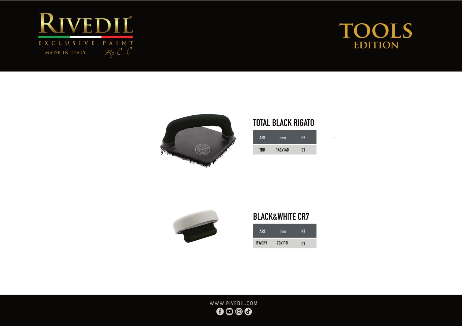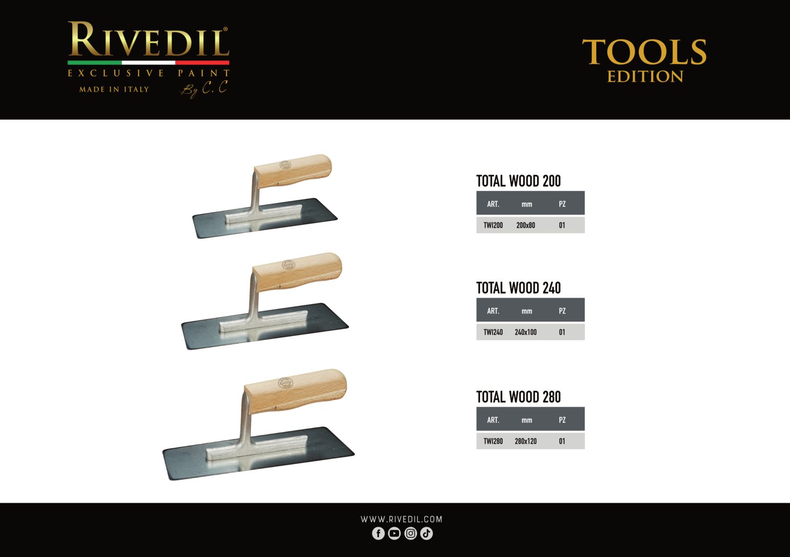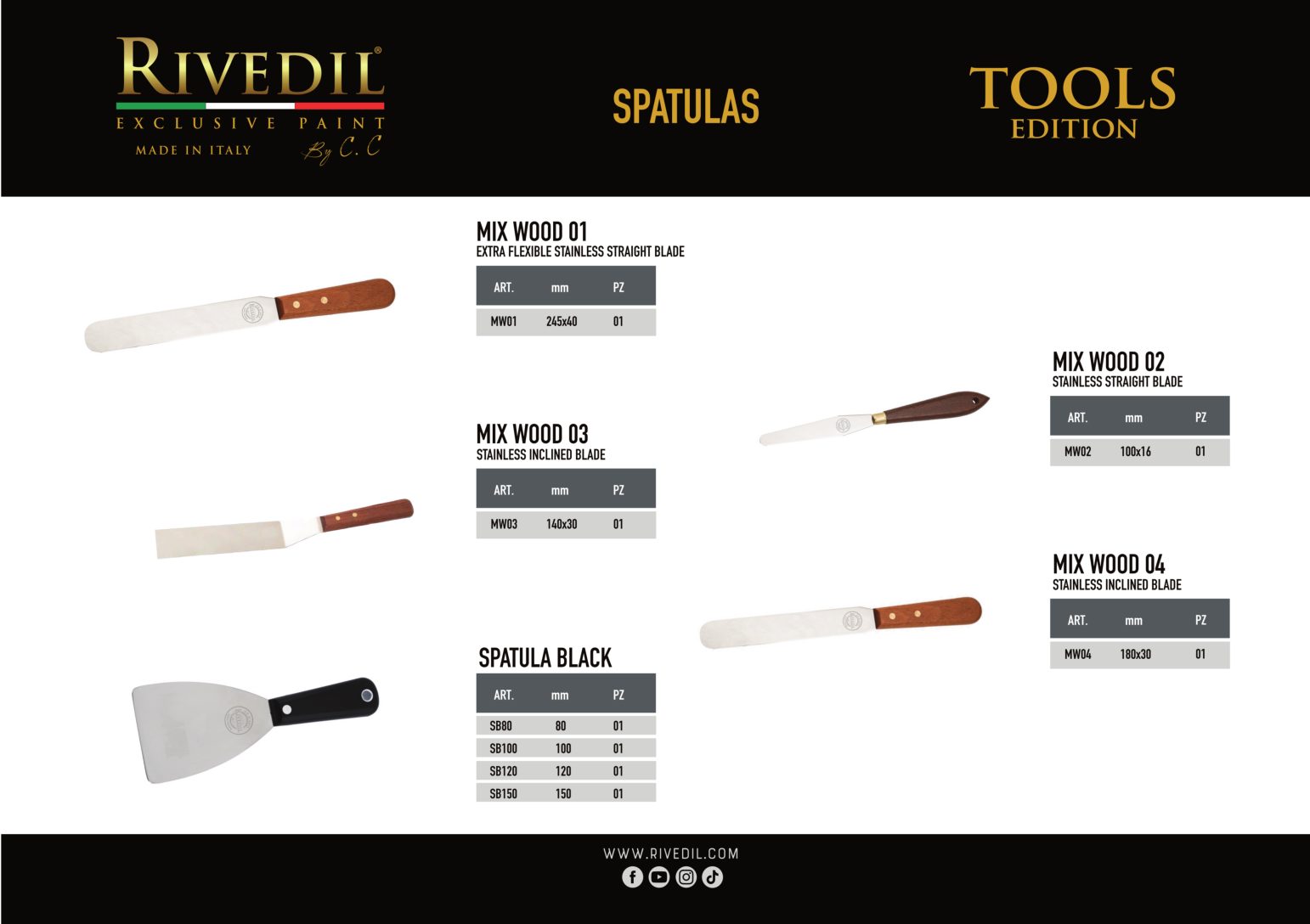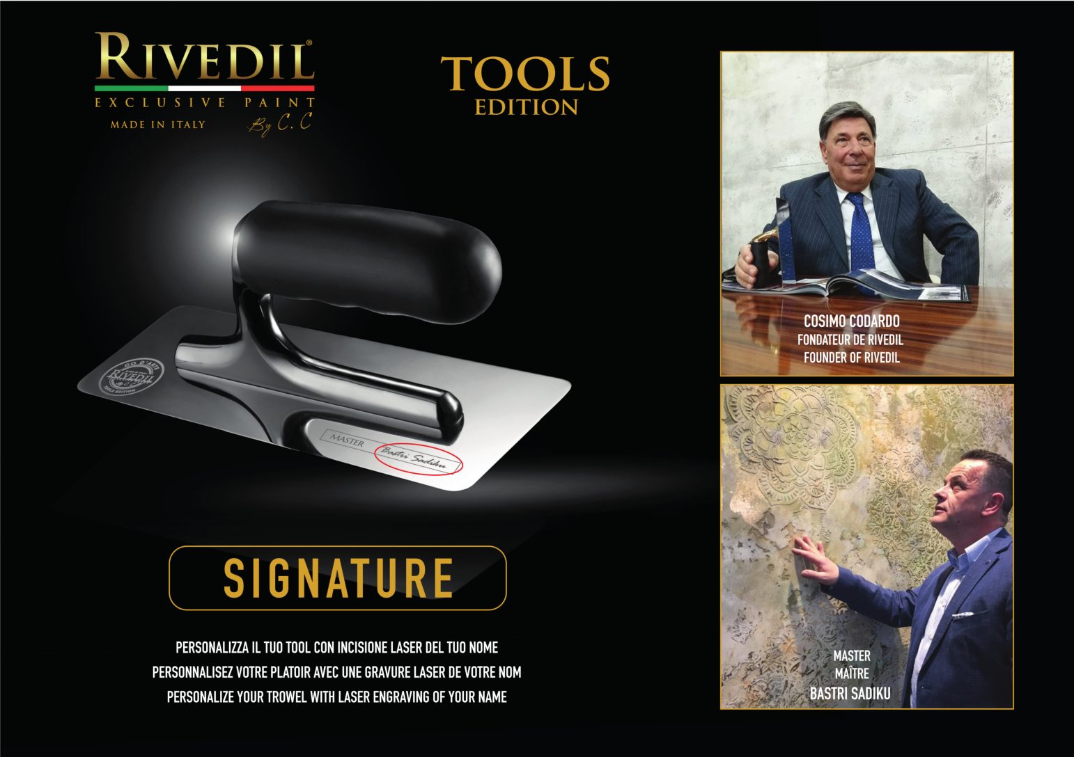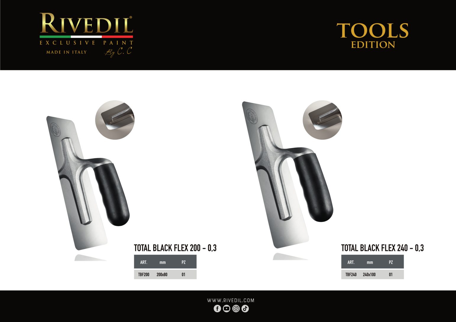 RIVEDIL mette a vostra disposizione una gamma completa di TOOLS professionali della migliore qualità. I TOOLS riportano il brand Rivedil elegantemente inciso a laser. Ogni TOOL é stato selezionato e provato dai nostri MASTER, sulla base di una decennale esperienza. I nostri TOOL ti permetteranno di realizzare le tue idee con progetti unici..