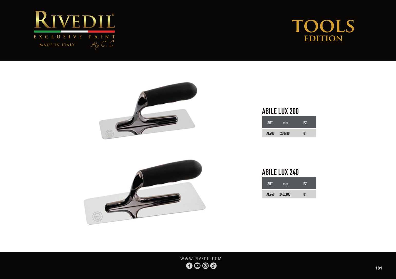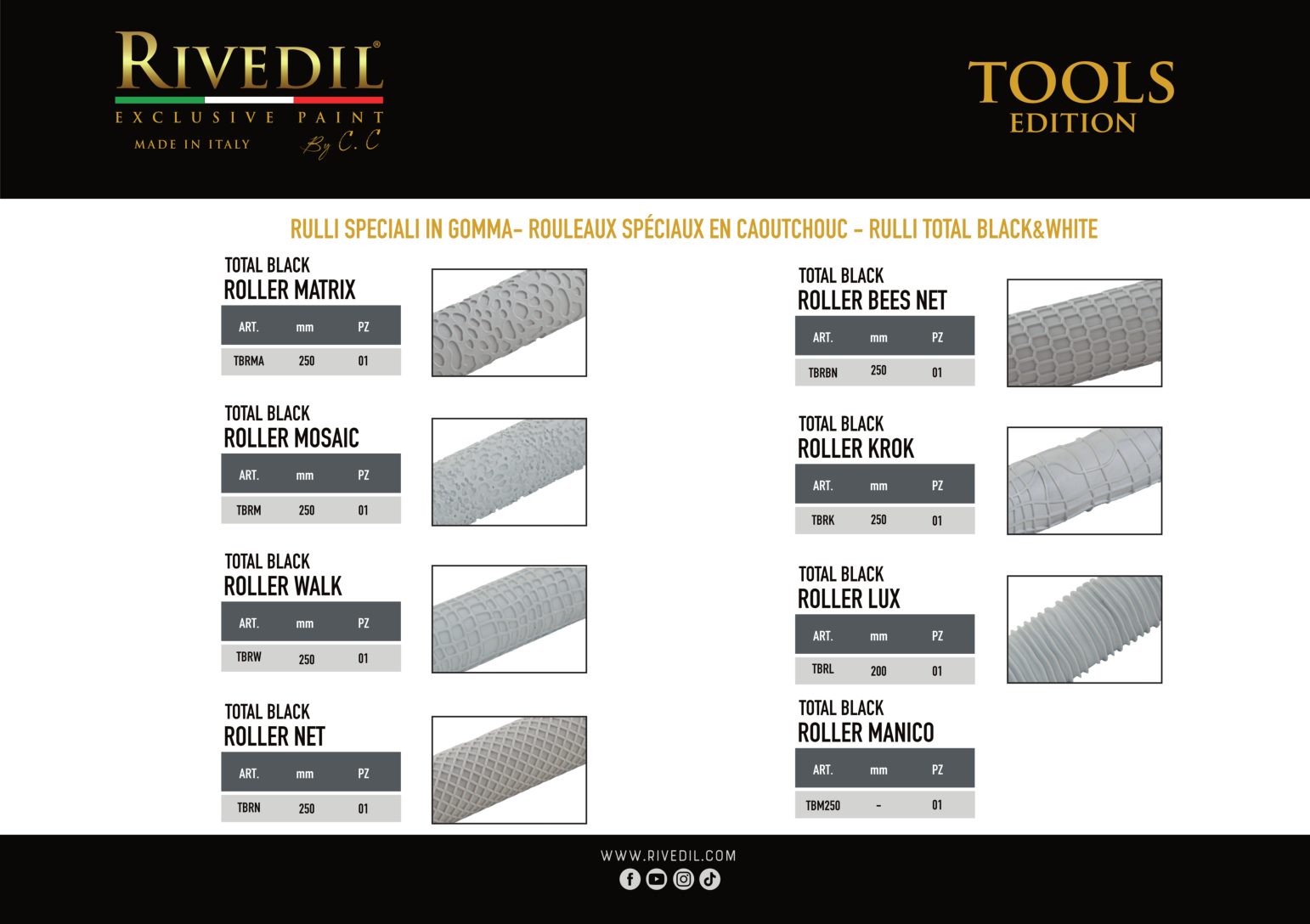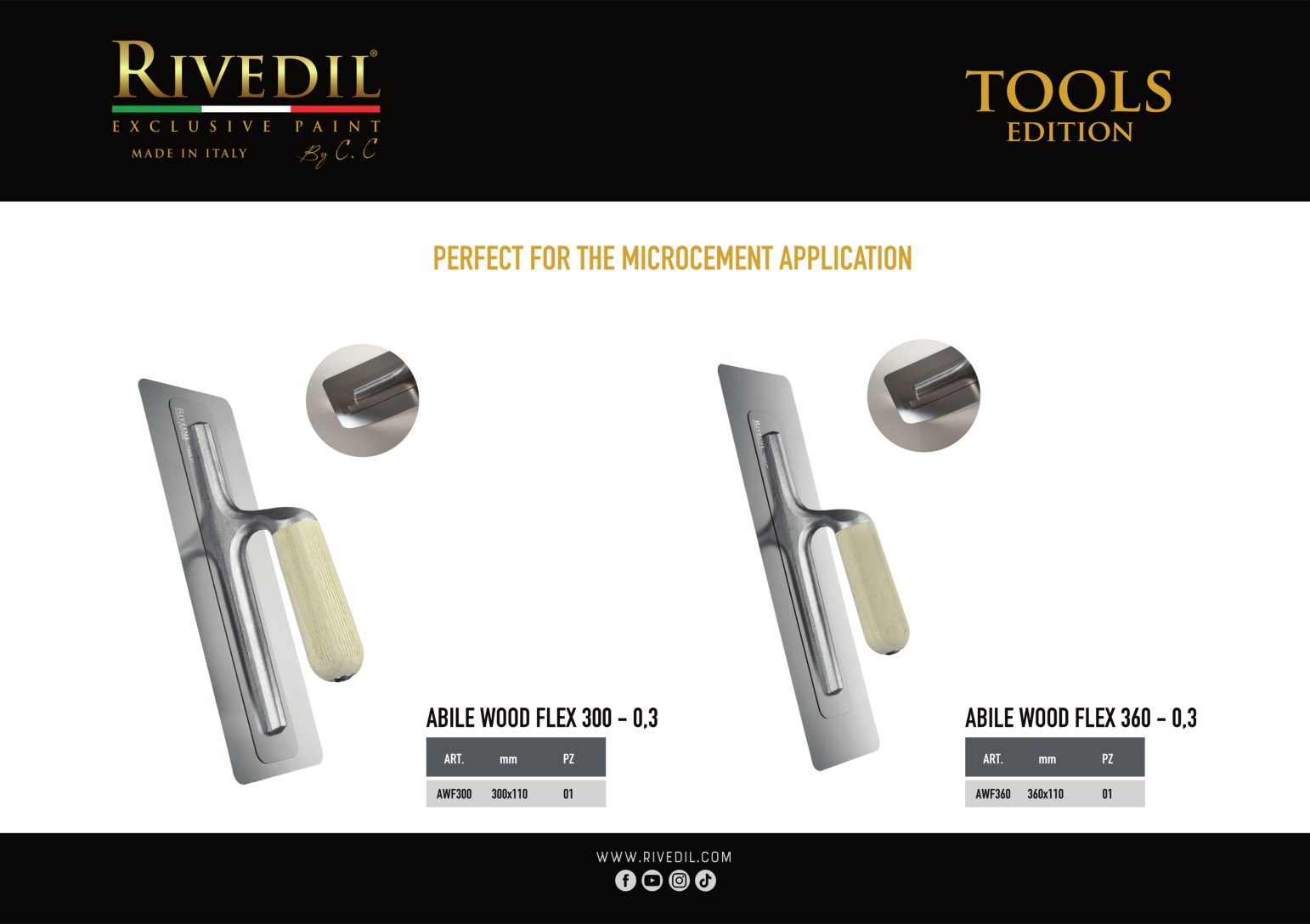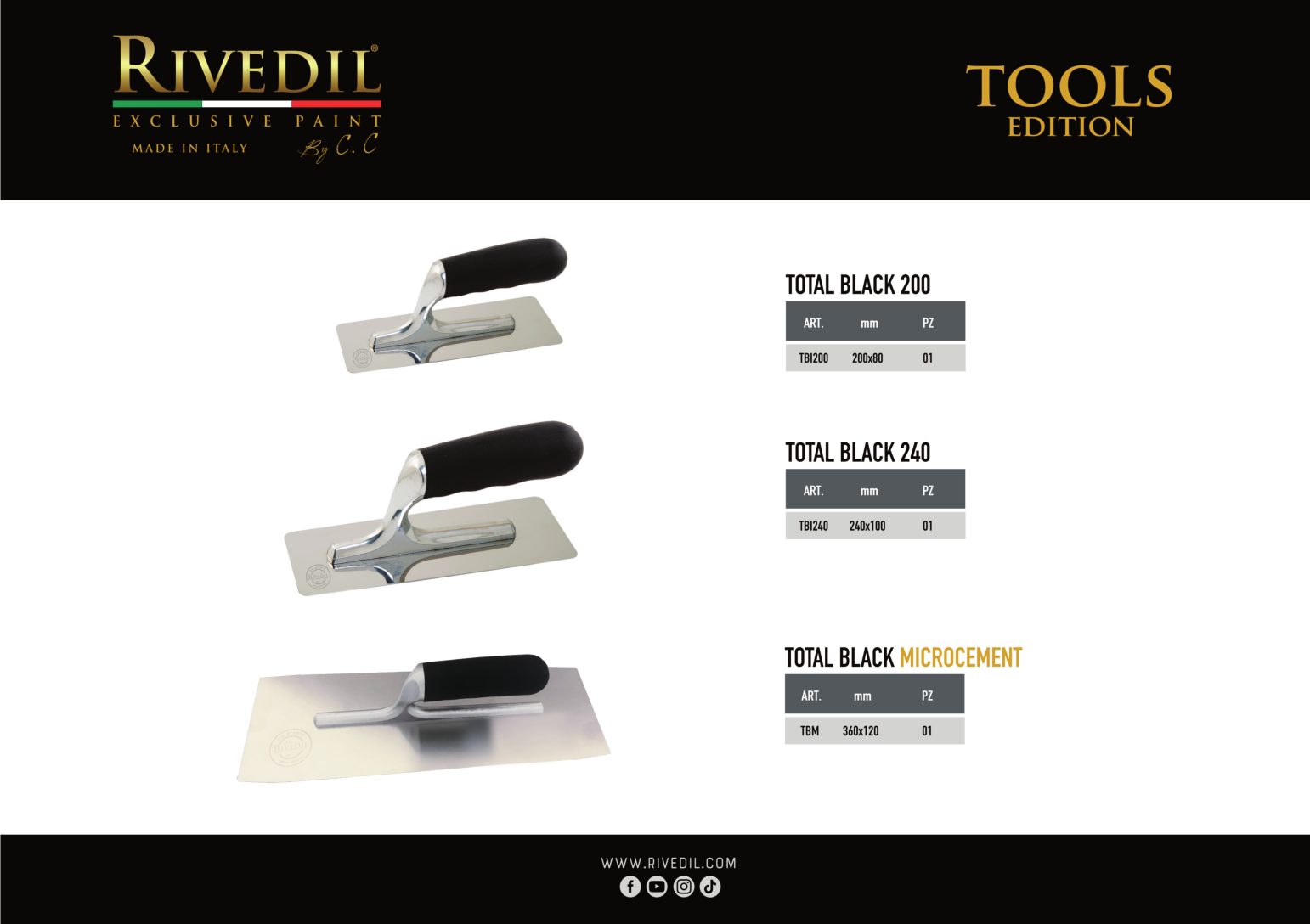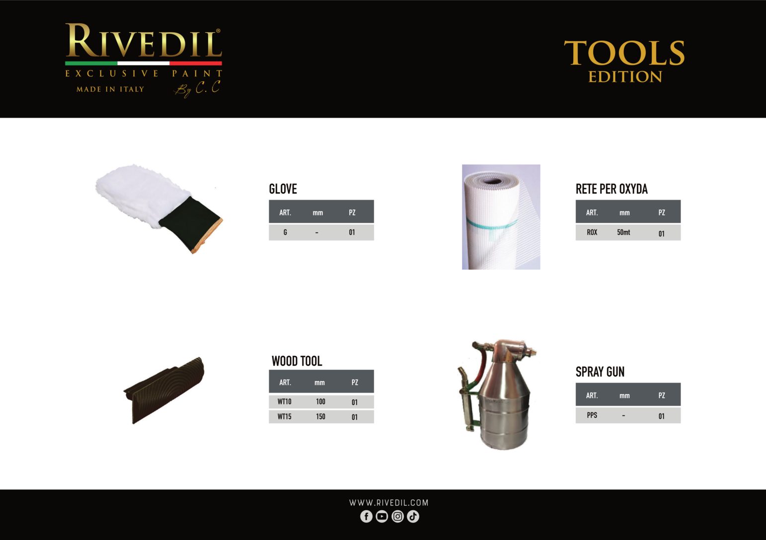 RIVEDIL mette a vostra disposizione una gamma completa di TOOLS professionali della migliore qualità. I TOOLS riportano il brand Rivedil elegantemente inciso a laser. Ogni TOOL é stato selezionato e provato dai nostri MASTER, sulla base di una decennale esperienza. I nostri TOOL ti permetteranno di realizzare le tue idee con progetti unici..